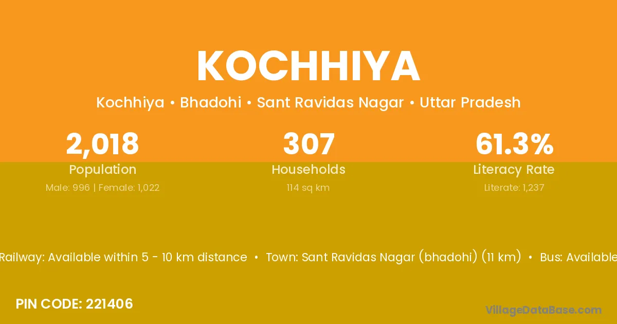 Sant Ravidas Nagar (bhadohi) (11 km) is the nearest town to Kochhiya village for major economic activities and is located approximately 11 km away.