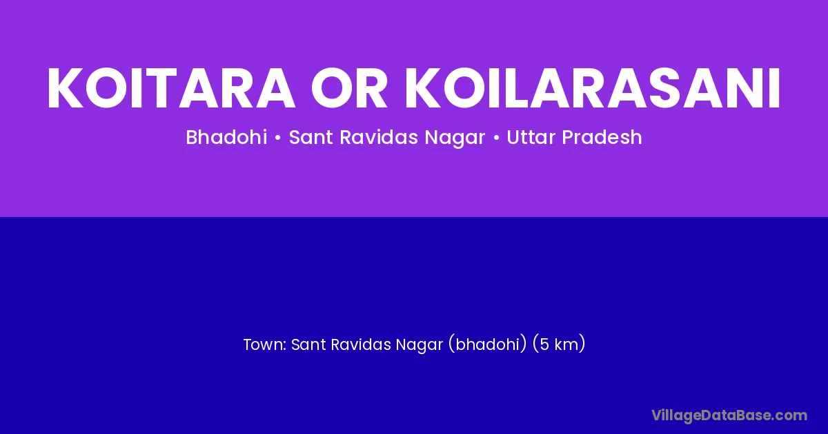 Sant Ravidas Nagar (bhadohi) (5 km) is the nearest town to Koitara Or Koilarasani village for major economic activities and is located approximately 5 km away.