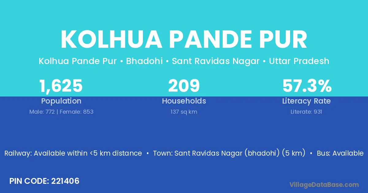 Sant Ravidas Nagar (bhadohi) (5 km) is the nearest town to Kolhua Pande Pur village for major economic activities and is located approximately 5 km away.
