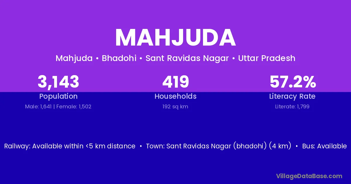 Sant Ravidas Nagar (bhadohi) (4 km) is the nearest town to Mahjuda village for major economic activities and is located approximately 4 km away.