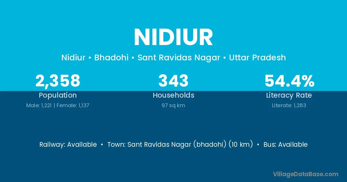 Sant Ravidas Nagar (bhadohi) (10 km) is the nearest town to Nidiur village for major economic activities and is located approximately 10 km away.