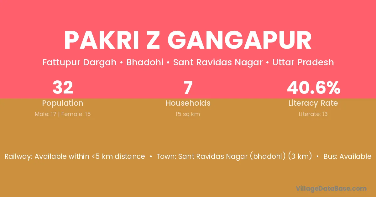 Sant Ravidas Nagar (bhadohi) (3 km) is the nearest town to Pakri Z Gangapur village for major economic activities and is located approximately 3 km away.