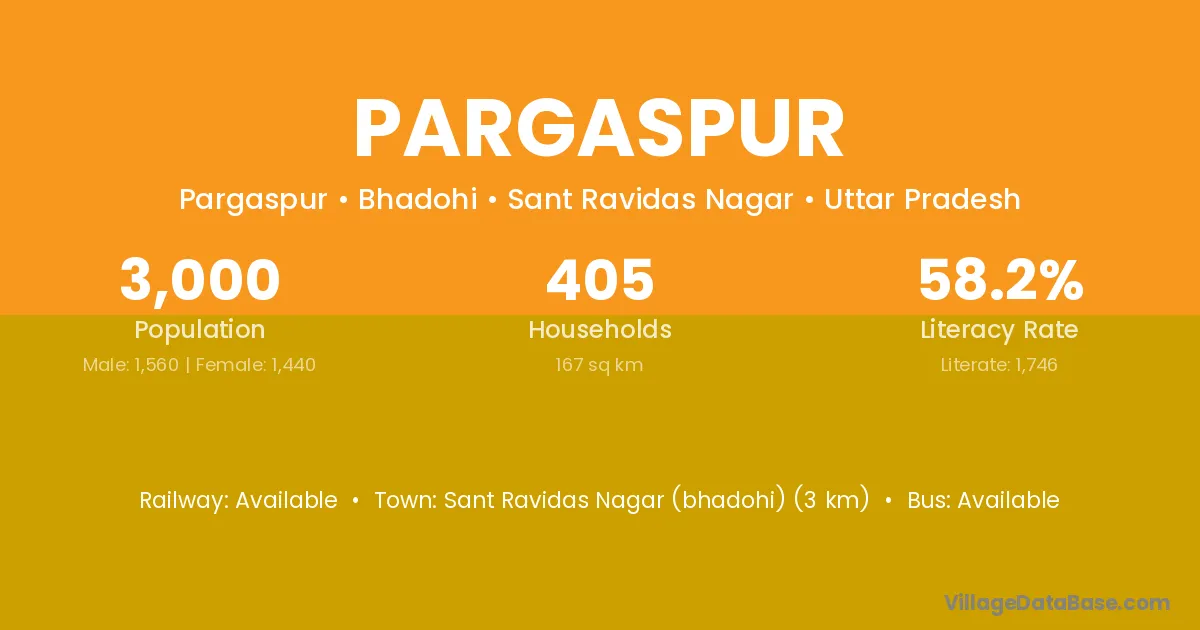 Sant Ravidas Nagar (bhadohi) (3 km) is the nearest town to Pargaspur village for major economic activities and is located approximately 3 km away.