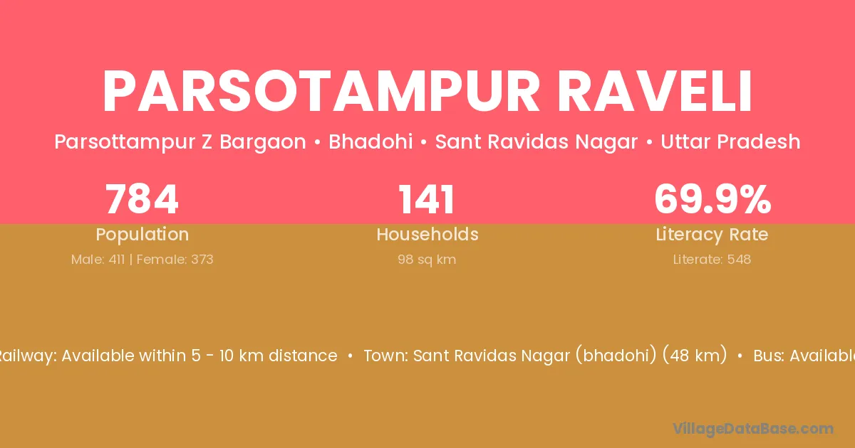 Sant Ravidas Nagar (bhadohi) (48 km) is the nearest town to Parsotampur Raveli village for major economic activities and is located approximately 48 km away.