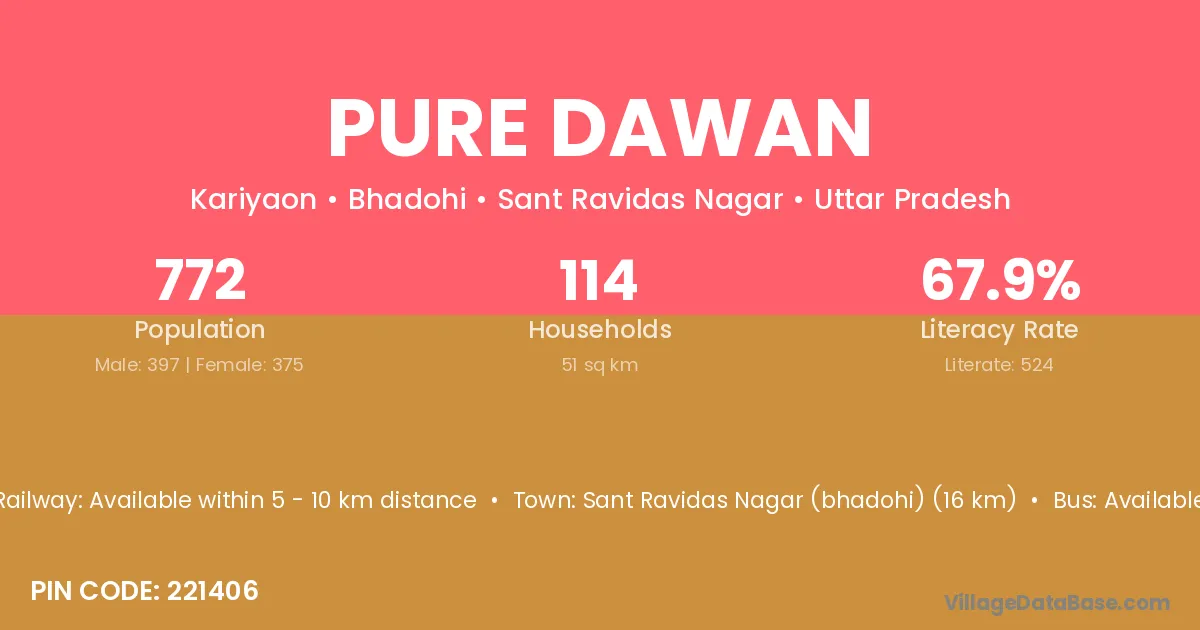 Sant Ravidas Nagar (bhadohi) (16 km) is the nearest town to Pure Dawan village for major economic activities and is located approximately 16 km away.