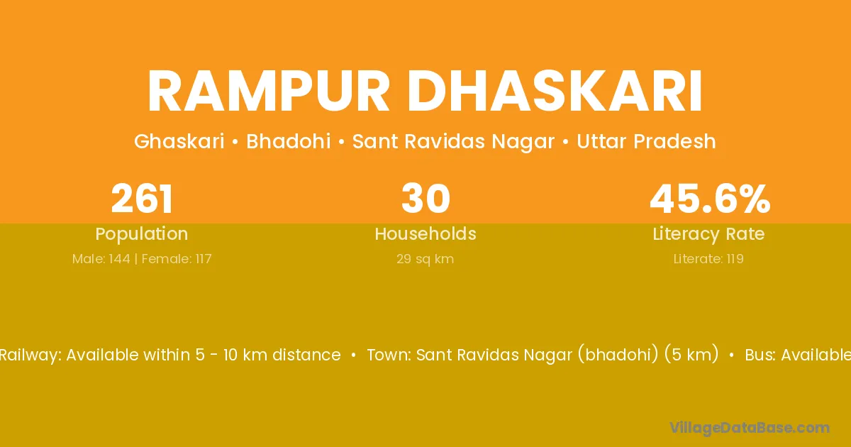 Sant Ravidas Nagar (bhadohi) (5 km) is the nearest town to Rampur Dhaskari village for major economic activities and is located approximately 5 km away.