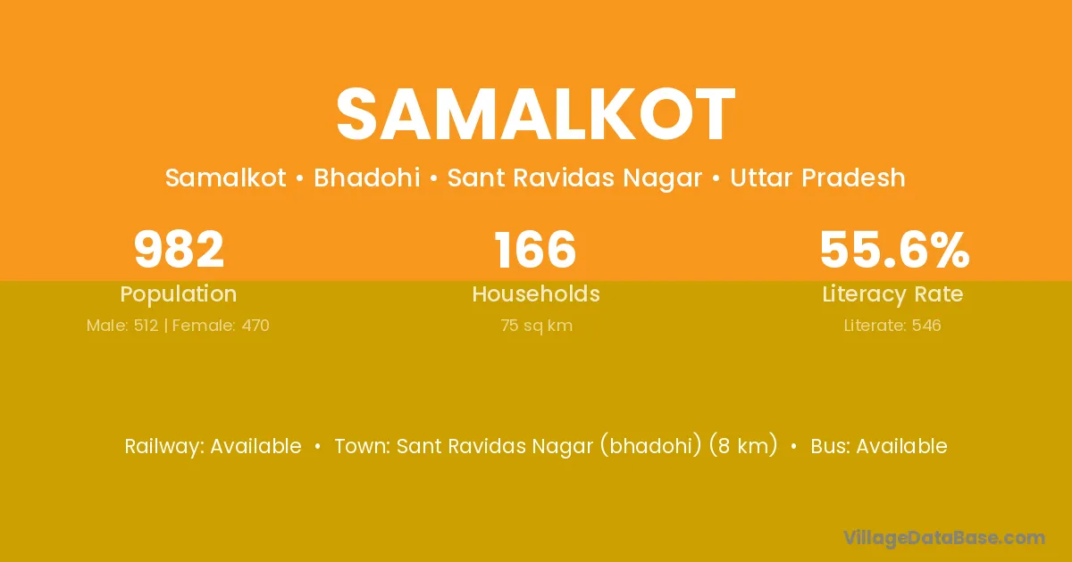 Sant Ravidas Nagar (bhadohi) (8 km) is the nearest town to Samalkot village for major economic activities and is located approximately 8 km away.