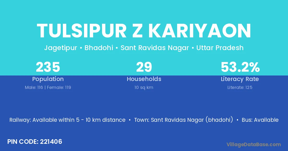Sant Ravidas Nagar (bhadohi) is the nearest town to Tulsipur Z Kariyaon village for major economic activities