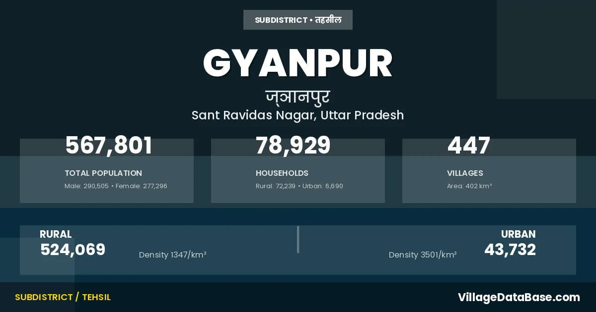 According to the 2011 census The total area of Gyanpur Tehsil is 402 km², with a population of 567801 people. The population density is 1,414 inhabitants per square kilometre, and there are approximately 78929 houses in the sub district.