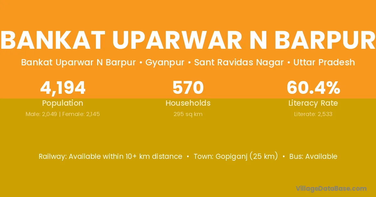 Gopiganj (25 km) is the nearest town to Bankat Uparwar N Barpur village for major economic activities and is located approximately 25 km away.