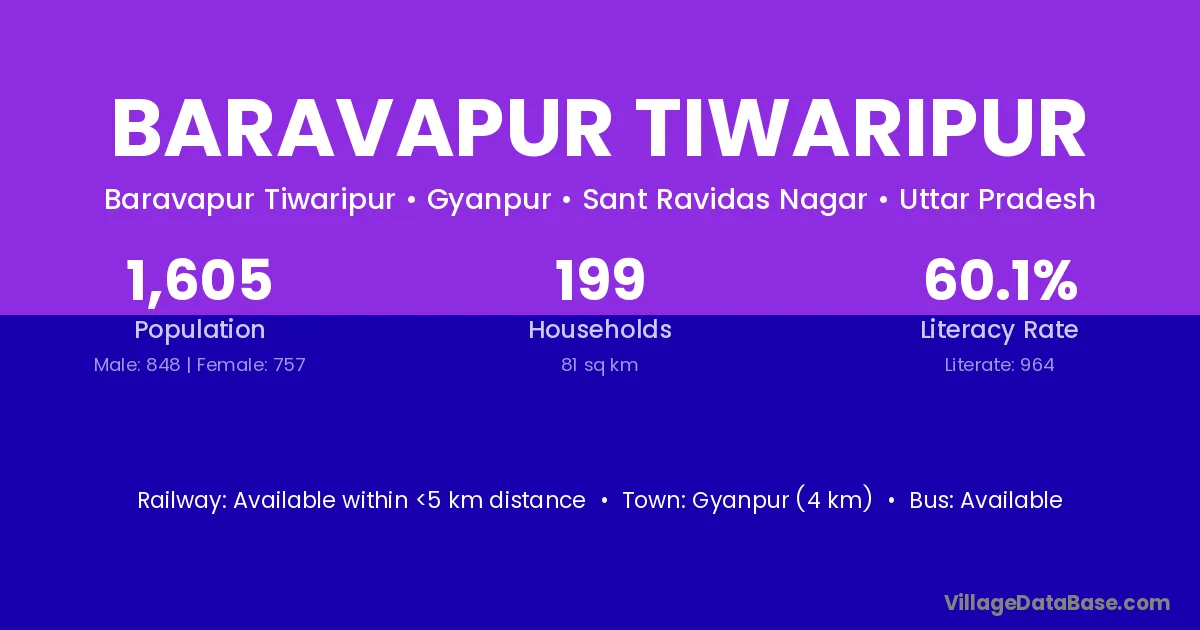 Gyanpur (4 km) is the nearest town to Baravapur Tiwaripur village for major economic activities and is located approximately 4 km away.