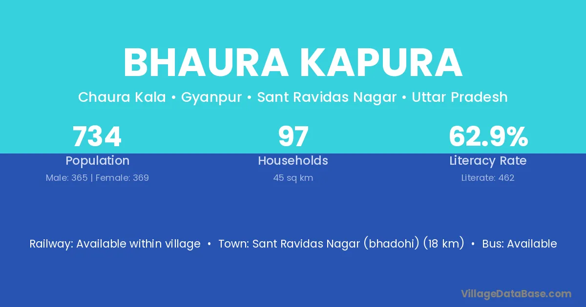 Sant Ravidas Nagar (bhadohi) (18 km) is the nearest town to Bhaura Kapura village for major economic activities and is located approximately 18 km away.