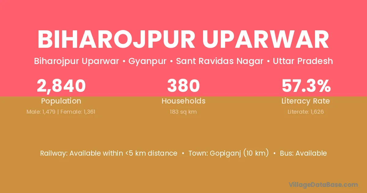 Gopiganj (10 km) is the nearest town to Biharojpur Uparwar village for major economic activities and is located approximately 10 km away.