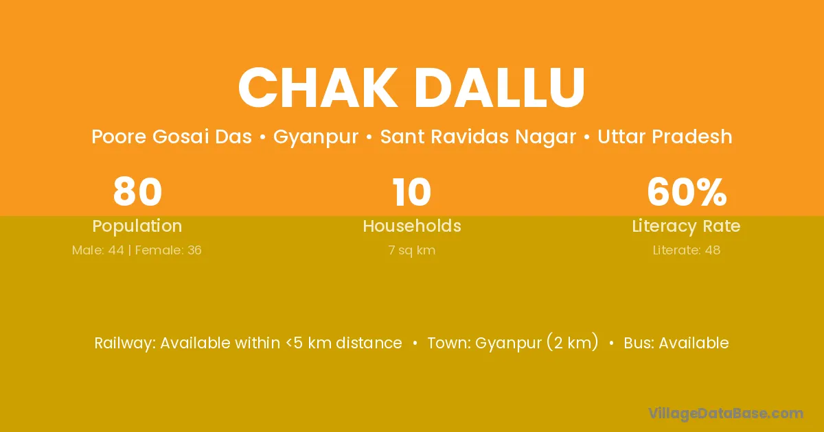 Gyanpur (2 km) is the nearest town to Chak Dallu village for major economic activities and is located approximately 2 km away.