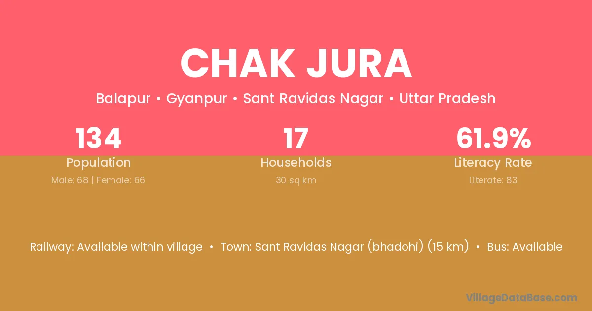 Sant Ravidas Nagar (bhadohi) (15 km) is the nearest town to Chak Jura village for major economic activities and is located approximately 15 km away.