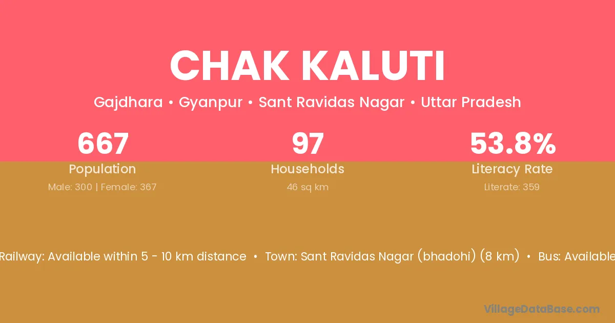 Sant Ravidas Nagar (bhadohi) (8 km) is the nearest town to Chak Kaluti village for major economic activities and is located approximately 8 km away.