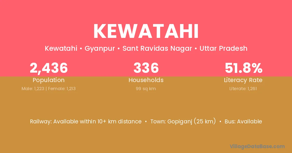 Gopiganj (25 km) is the nearest town to Kewatahi village for major economic activities and is located approximately 25 km away.