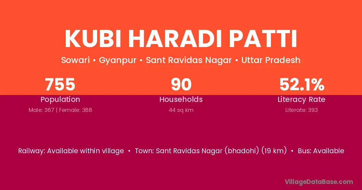 Sant Ravidas Nagar (bhadohi) (19 km) is the nearest town to Kubi Haradi Patti village for major economic activities and is located approximately 19 km away.