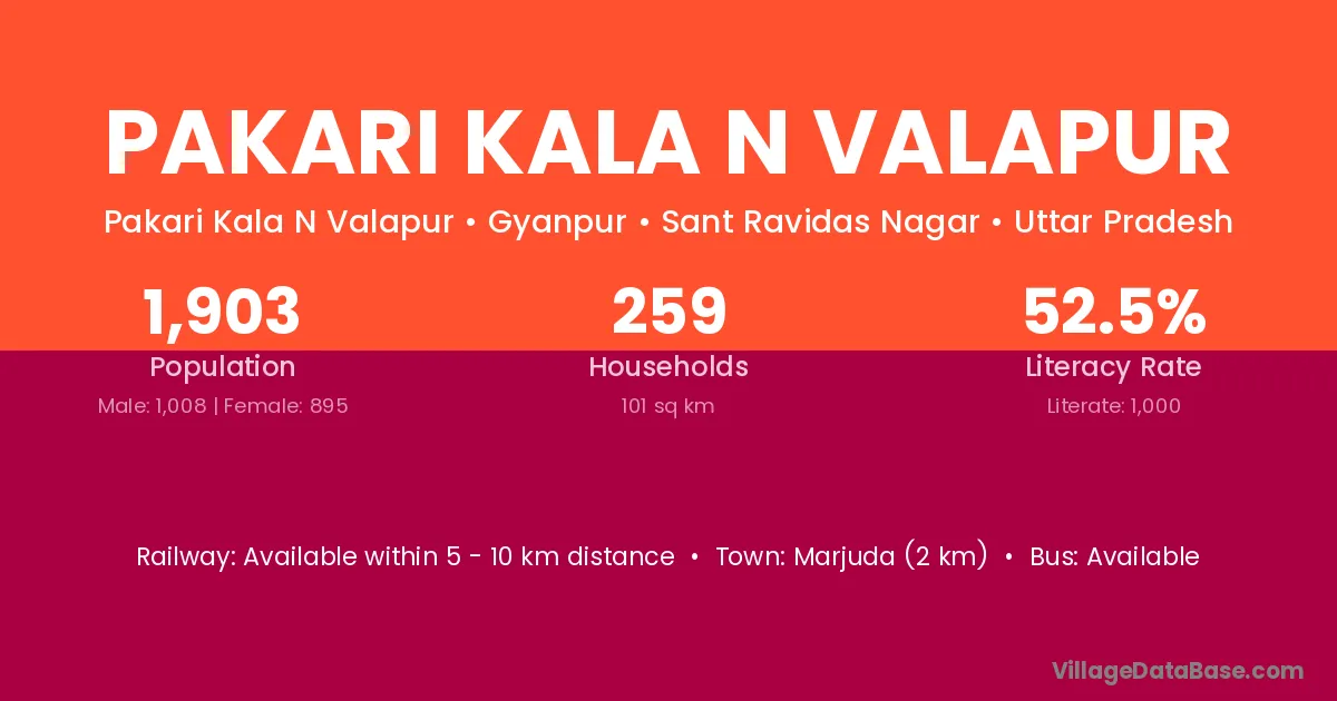 Pakari Kala N Valapur village has a total population of 1,903 people, of which 1,008 are males and 895 are females.