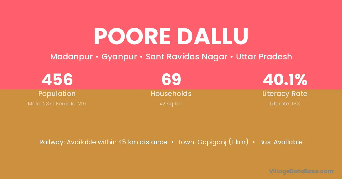 Gopiganj (1 km) is the nearest town to Poore Dallu village for major economic activities and is located approximately 1 km away.