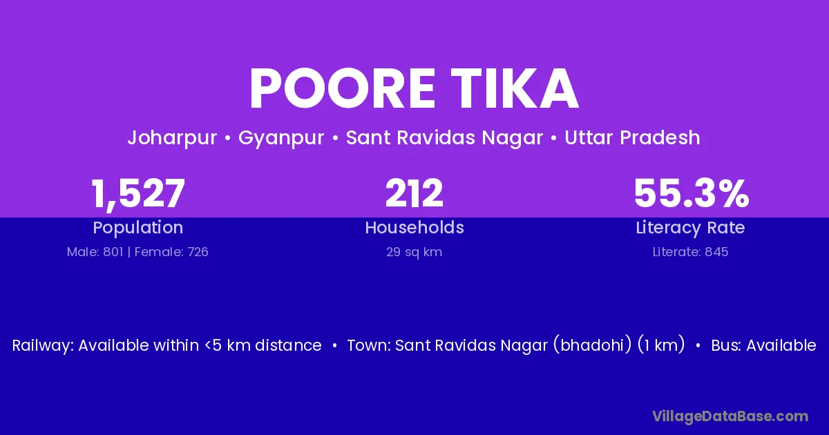 Sant Ravidas Nagar (bhadohi) (1 km) is the nearest town to Poore Tika village for major economic activities and is located approximately 1 km away.