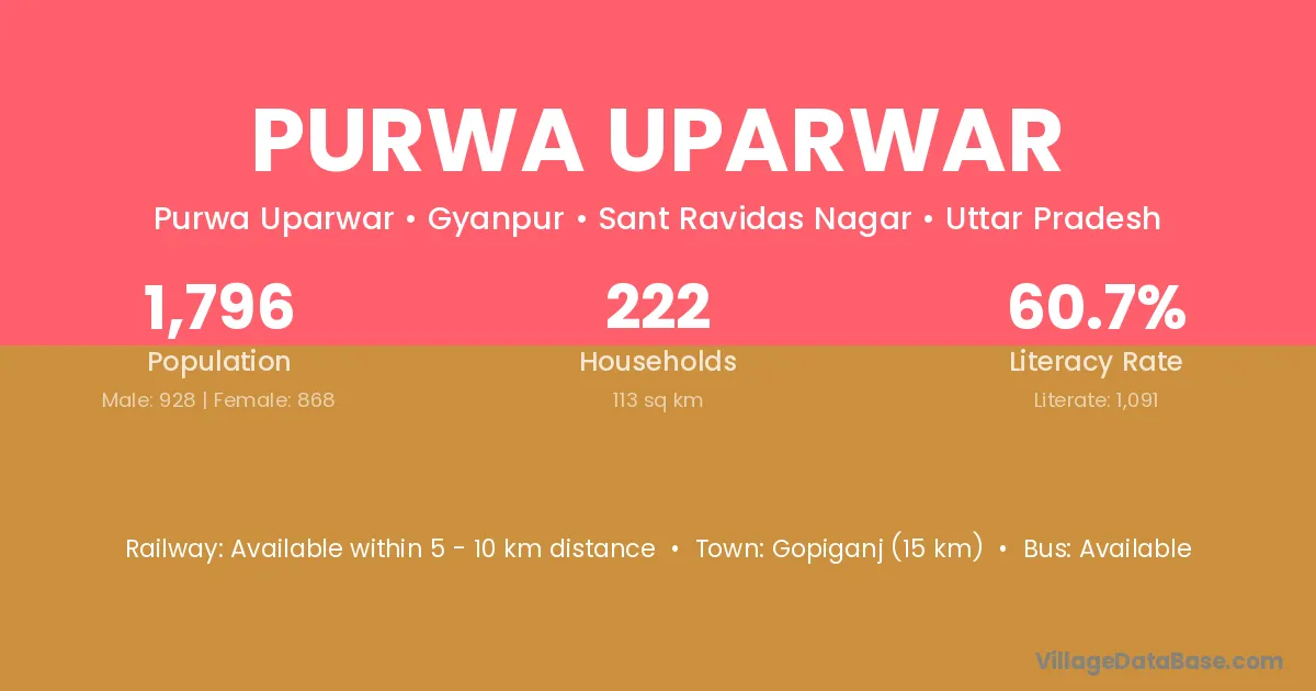 Gopiganj (15 km) is the nearest town to Purwa Uparwar village for major economic activities and is located approximately 15 km away.
