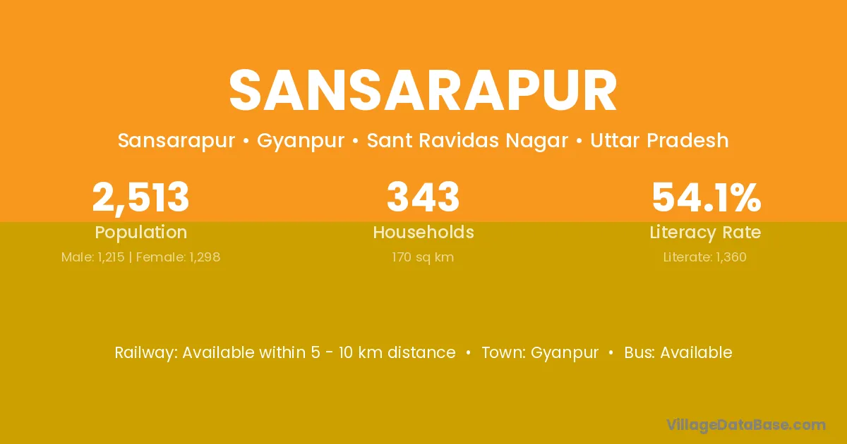 Sansarapur village has a total population of 2,513 people, of which 1,215 are males and 1,298 are females.
