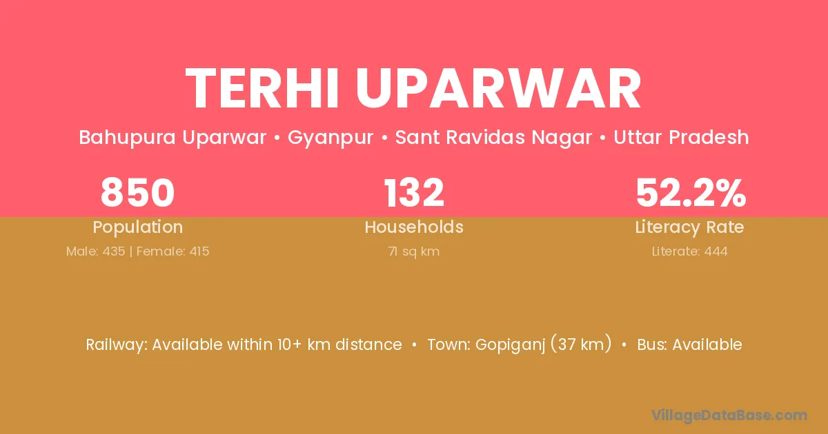Gopiganj (37 km) is the nearest town to Terhi Uparwar village for major economic activities and is located approximately 37 km away.