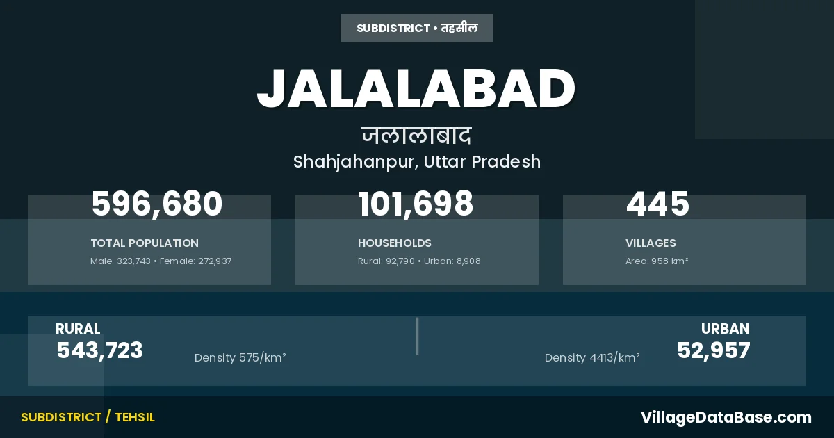 According to the 2011 census The total area of Jalalabad Tehsil is 958 km², with a population of 596680 people. The population density is 623 inhabitants per square kilometre, and there are approximately 101698 houses in the sub district.