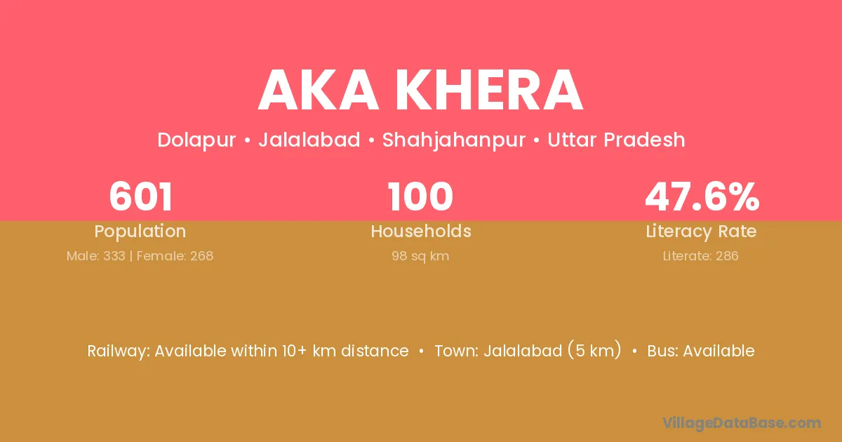 Aka Khera village has a total population of 601 people, of which 333 are males and 268 are females.