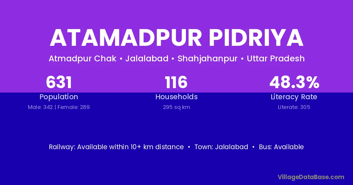 Atamadpur Pidriya village has a total population of 631 people, of which 342 are males and 289 are females.