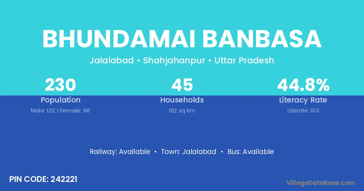 Bhundamai Banbasa village has a total population of 230 people, of which 132 are males and 98 are females.