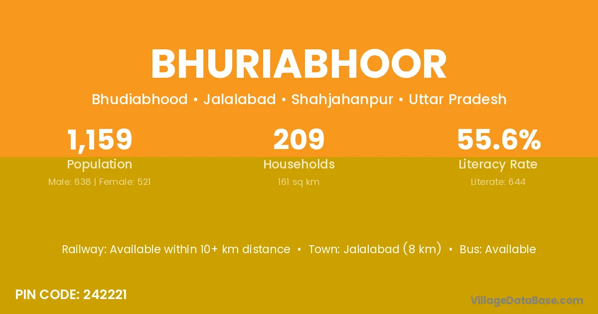 Jalalabad (8 km) is the nearest town to Bhuriabhoor village for major economic activities and is located approximately 8 km away.