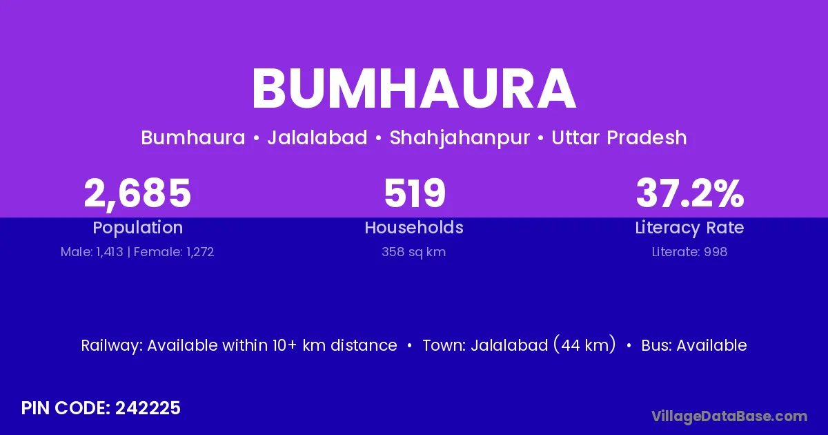 Jalalabad (44 km) is the nearest town to Bumhaura village for major economic activities and is located approximately 44 km away.