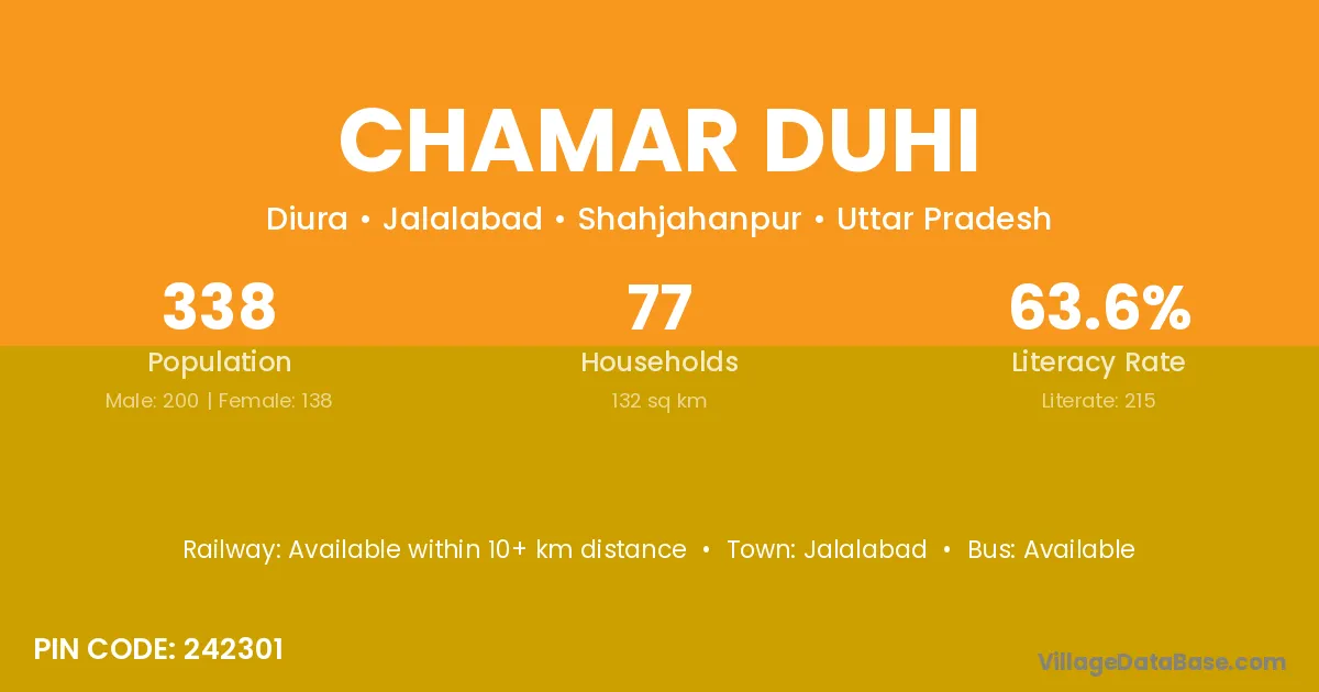 Chamar Duhi village has a total population of 338 people, of which 200 are males and 138 are females.