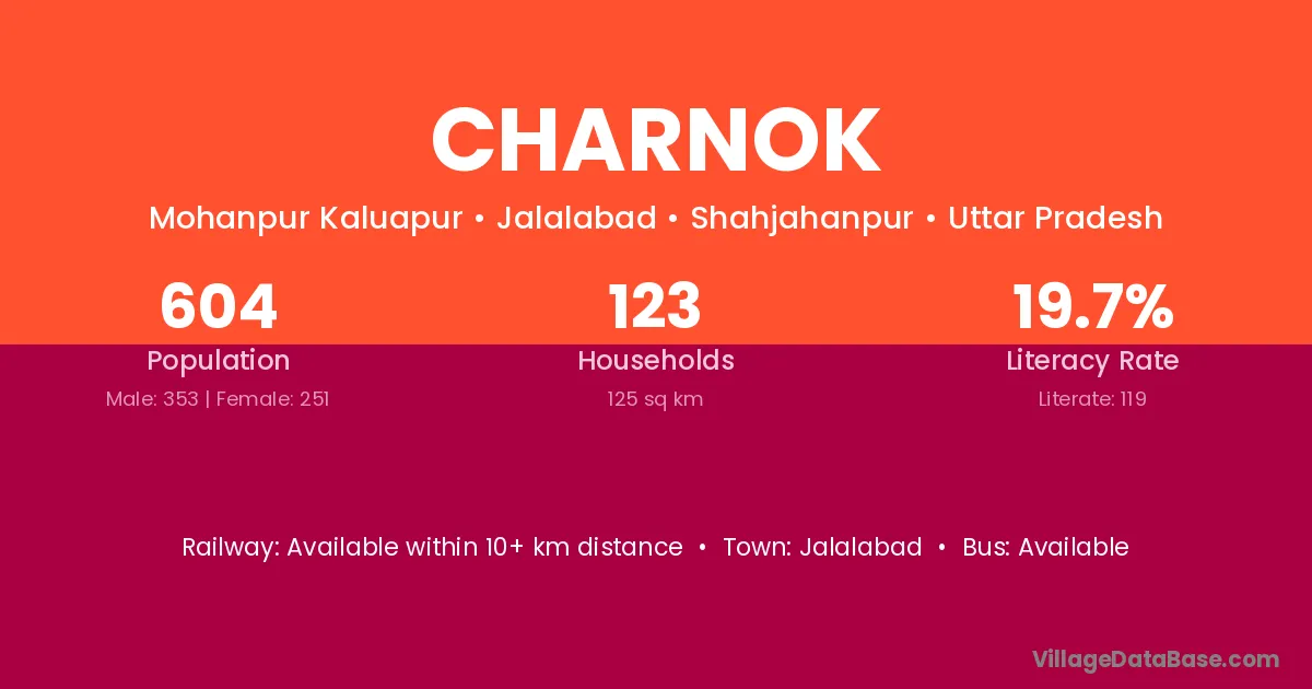 Charnok village has a total population of 604 people, of which 353 are males and 251 are females.