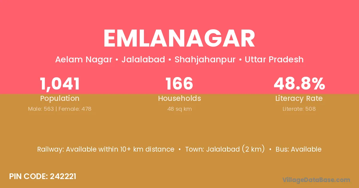 Jalalabad (2 km) is the nearest town to Emlanagar village for major economic activities and is located approximately 2 km away.