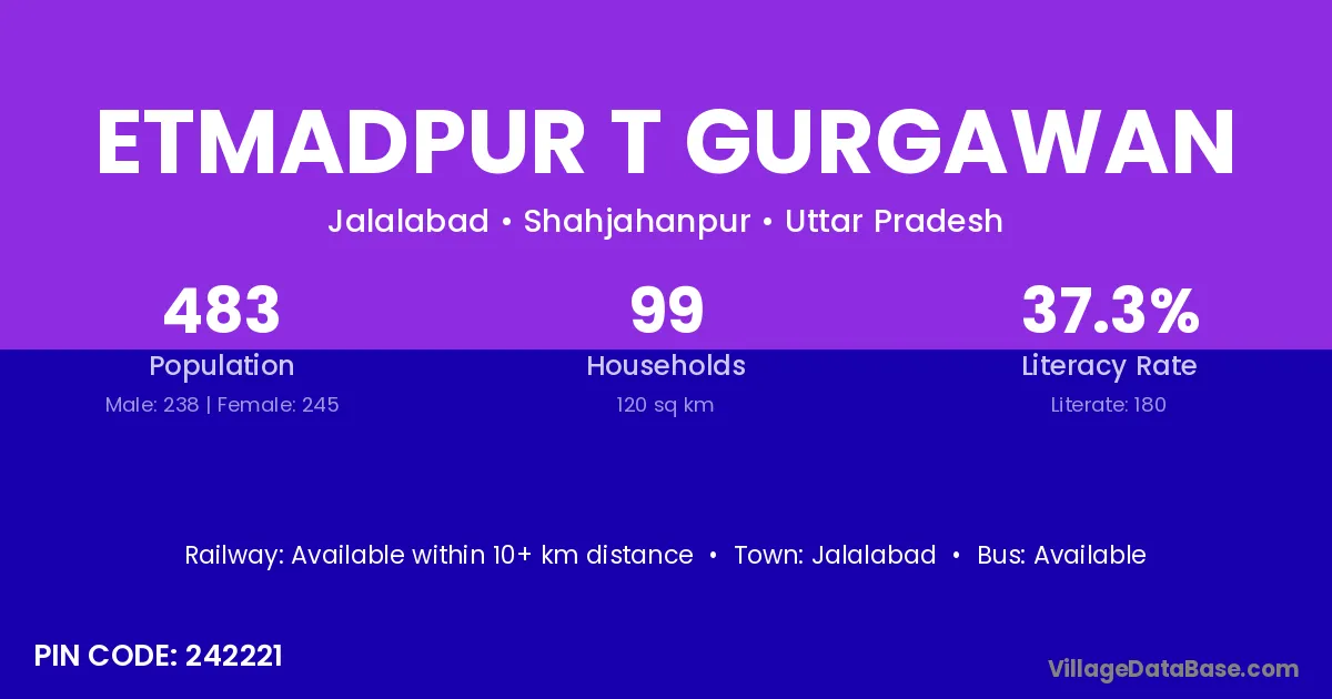 Etmadpur T Gurgawan village has a total population of 483 people, of which 238 are males and 245 are females.