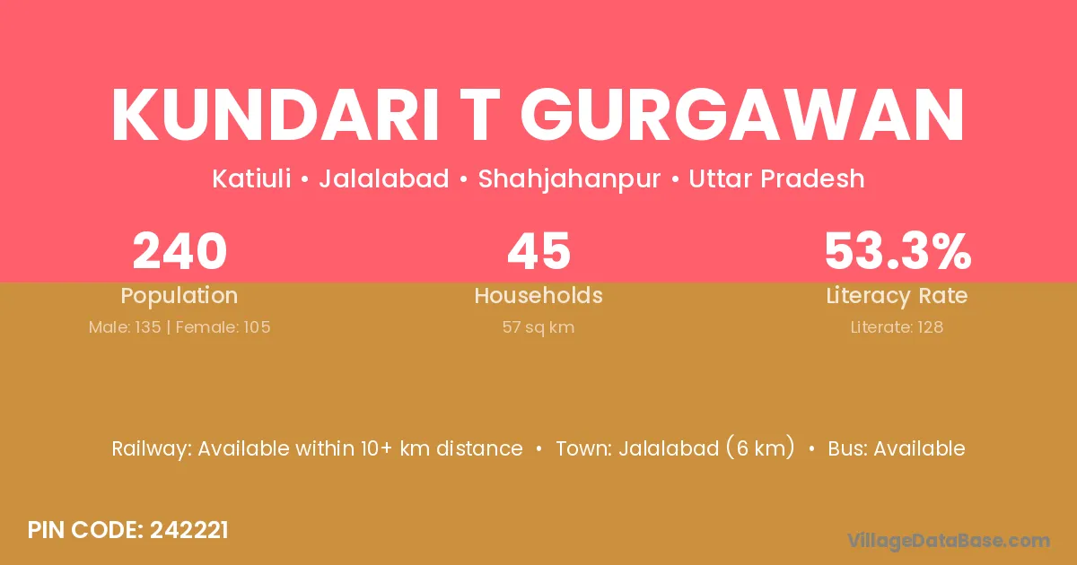 Kundari T Gurgawan village has a total population of 240 people, of which 135 are males and 105 are females.
