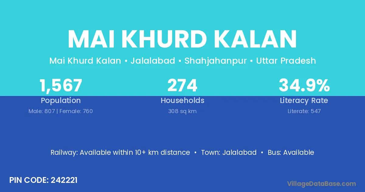 Mai Khurd Kalan village has a total population of 1,567 people, of which 807 are males and 760 are females.