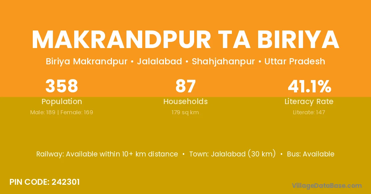 Makrandpur Ta Biriya village has a total population of 358 people, of which 189 are males and 169 are females.