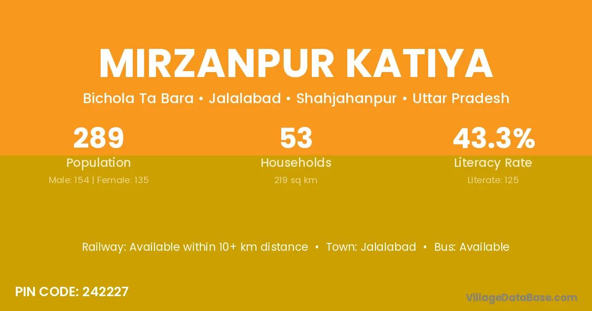 Mirzanpur Katiya village has a total population of 289 people, of which 154 are males and 135 are females.