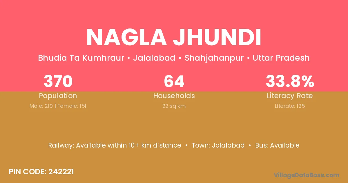 Nagla Jhundi village has a total population of 370 people, of which 219 are males and 151 are females.