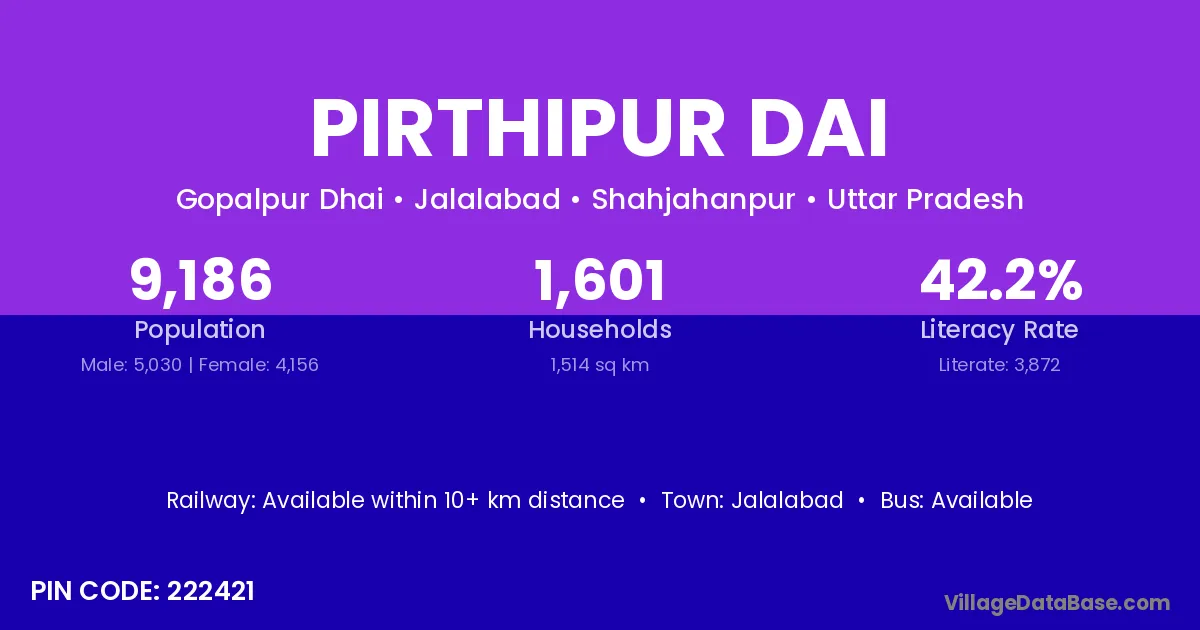 Pirthipur Dai village has a total population of 9,186 people, of which 5,030 are males and 4,156 are females.