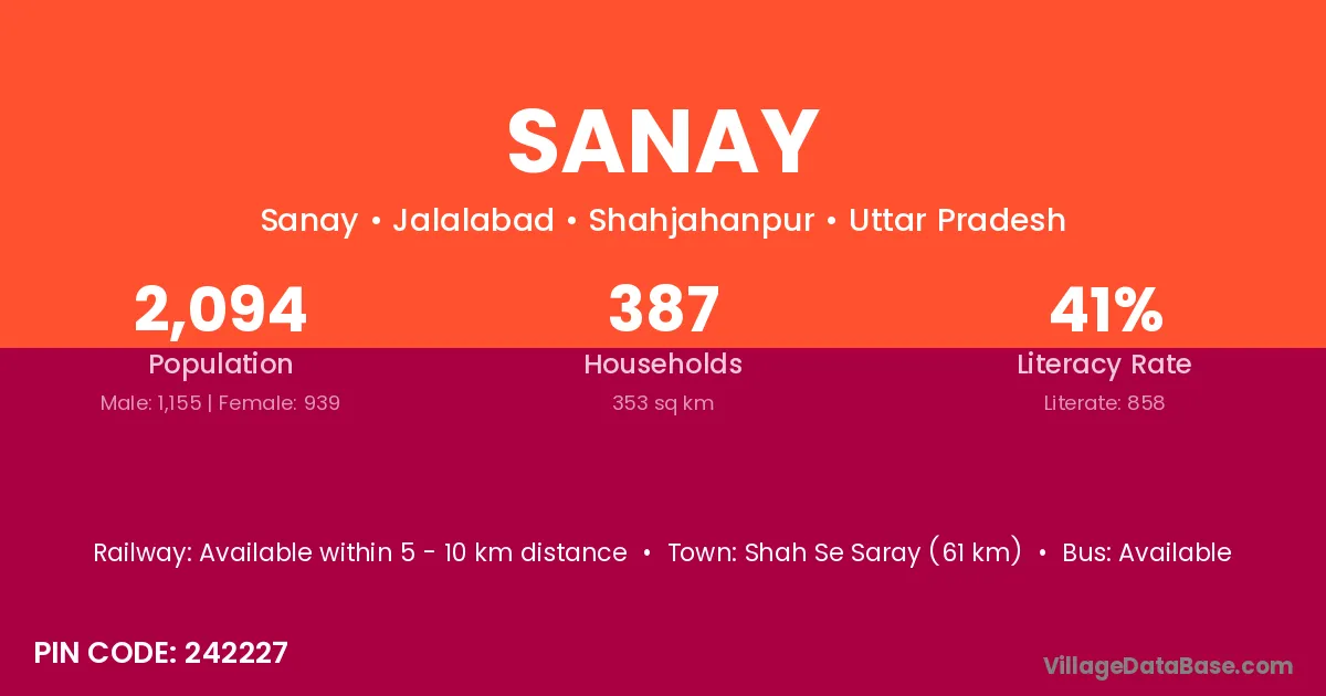 Shah Se Saray (61 km) is the nearest town to Sanay village for major economic activities and is located approximately 61 km away.