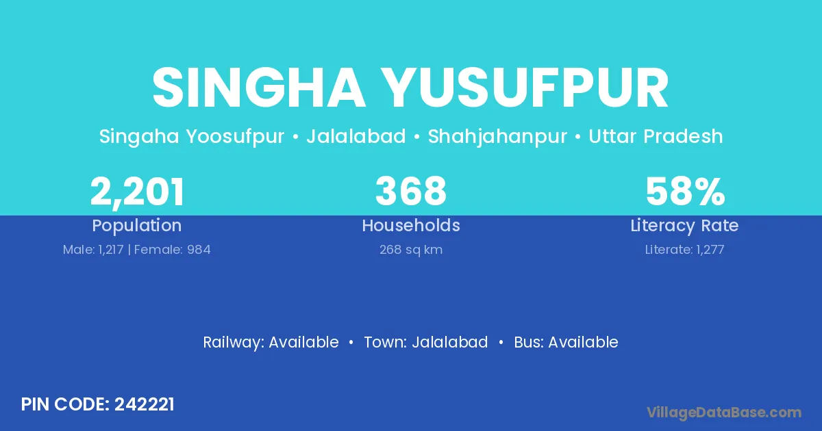 Singha Yusufpur village has a total population of 2,201 people, of which 1,217 are males and 984 are females.
