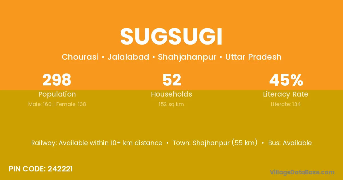 Shajhanpur (55 km) is the nearest town to Sugsugi village for major economic activities and is located approximately 55 km away.