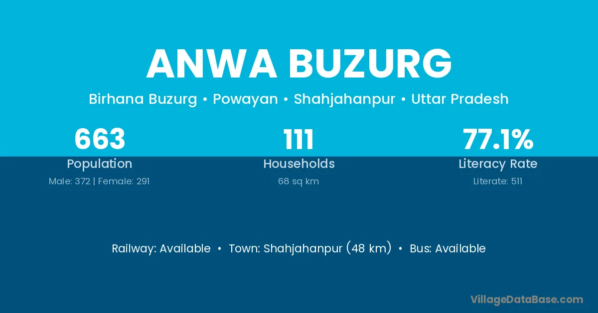 Shahjahanpur (48 km) is the nearest town to Anwa Buzurg village for major economic activities and is located approximately 48 km away.