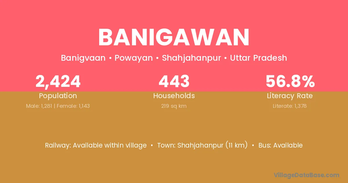 Banigawan village has a total population of 2,424 people, of which 1,281 are males and 1,143 are females.