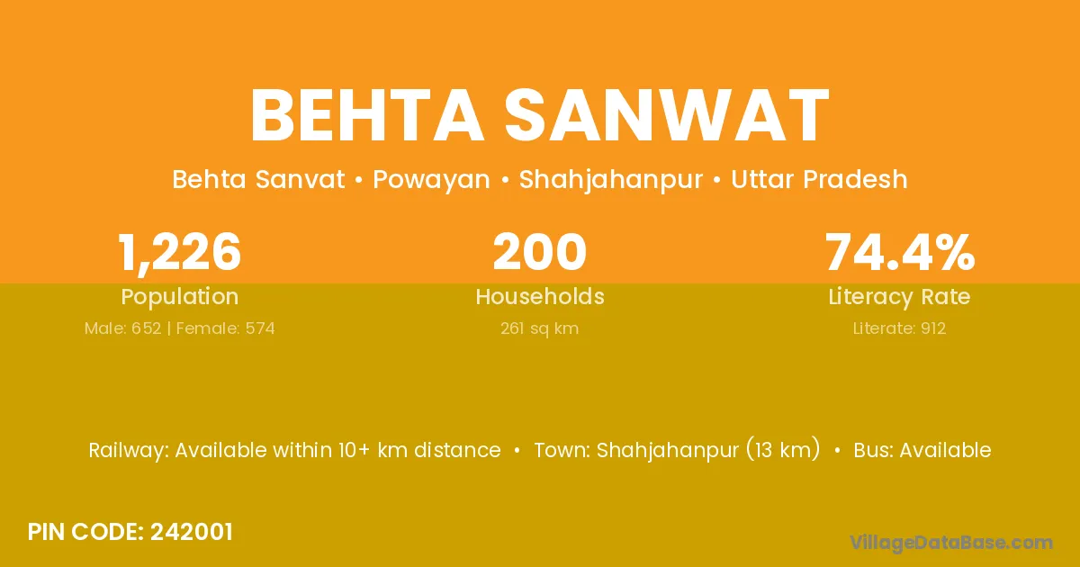 Shahjahanpur (13 km) is the nearest town to Behta Sanwat village for major economic activities and is located approximately 13 km away.
